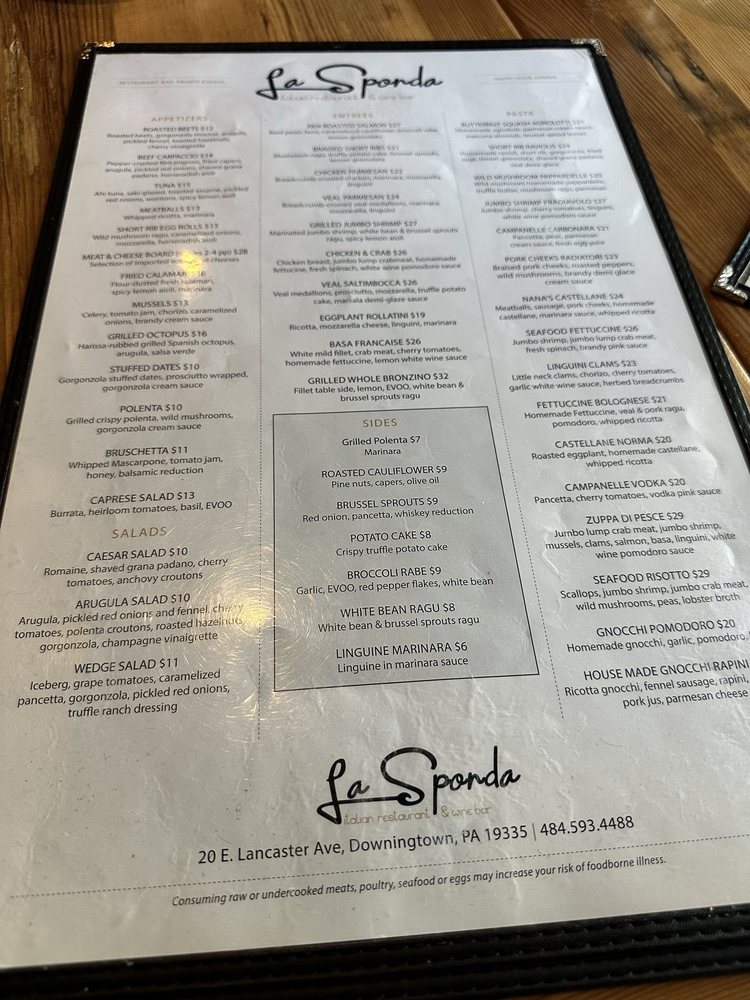 La Sponda, located in Downingtown, PA, is a charming Italian venue offering a top-notch dining experience. With a classy ambiance, attentive service, and a diverse menu, this restaurant is a must-visit. Customer reviews rave about the beet salad, veal saltimboca, and short rib eggrolls as standout dishes. The outdoor seating area provides a sense of seclusion, perfect for enjoying a meal on a nice day. The risotto, seafood, and salmon dishes are expertly prepared and bursting with flavor. Whether you're looking for a casual meal or a special occasion celebration, La Sponda caters to all dining preferences. Don't miss out on the opportunity to try their delicious food, impeccable service, and welcoming atmosphere.
